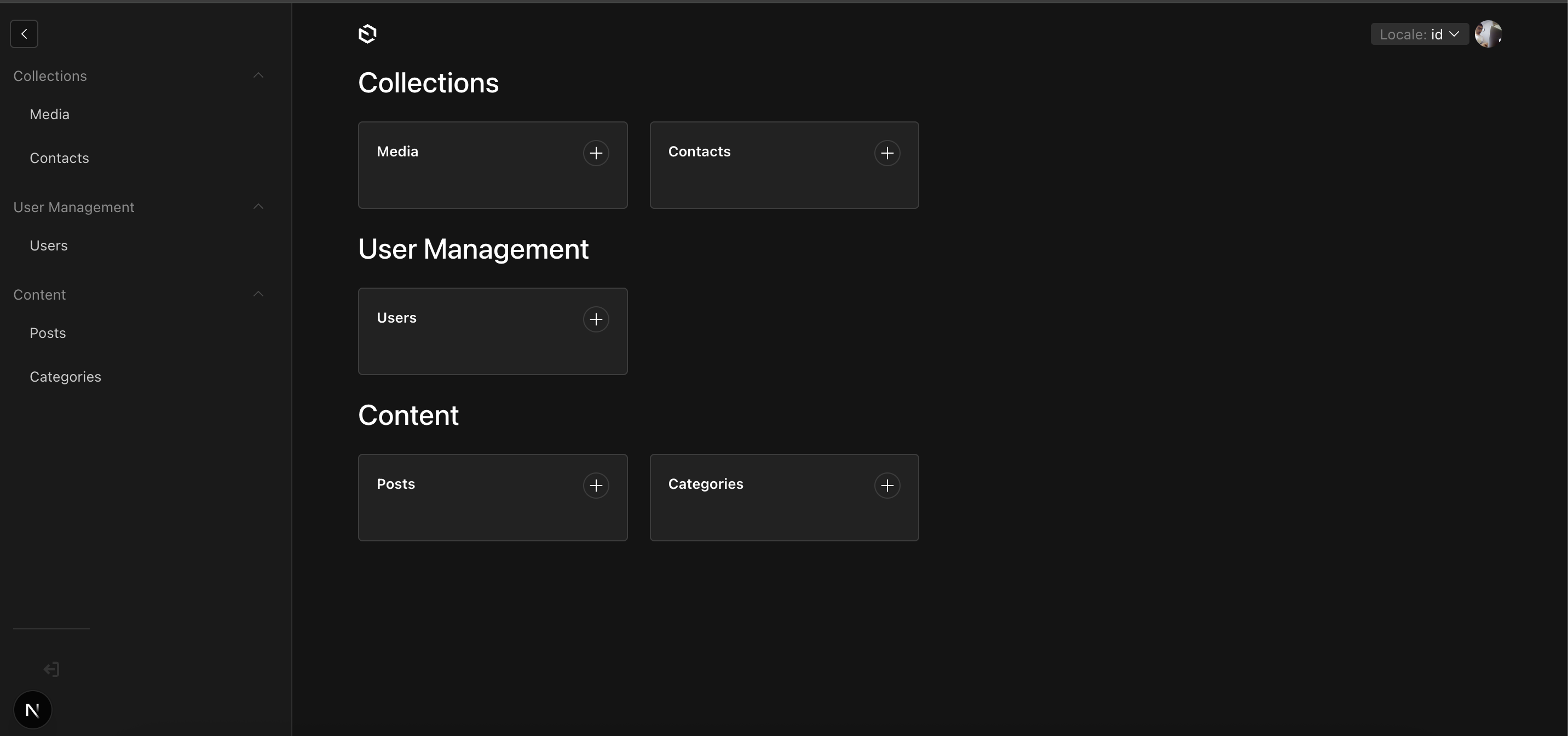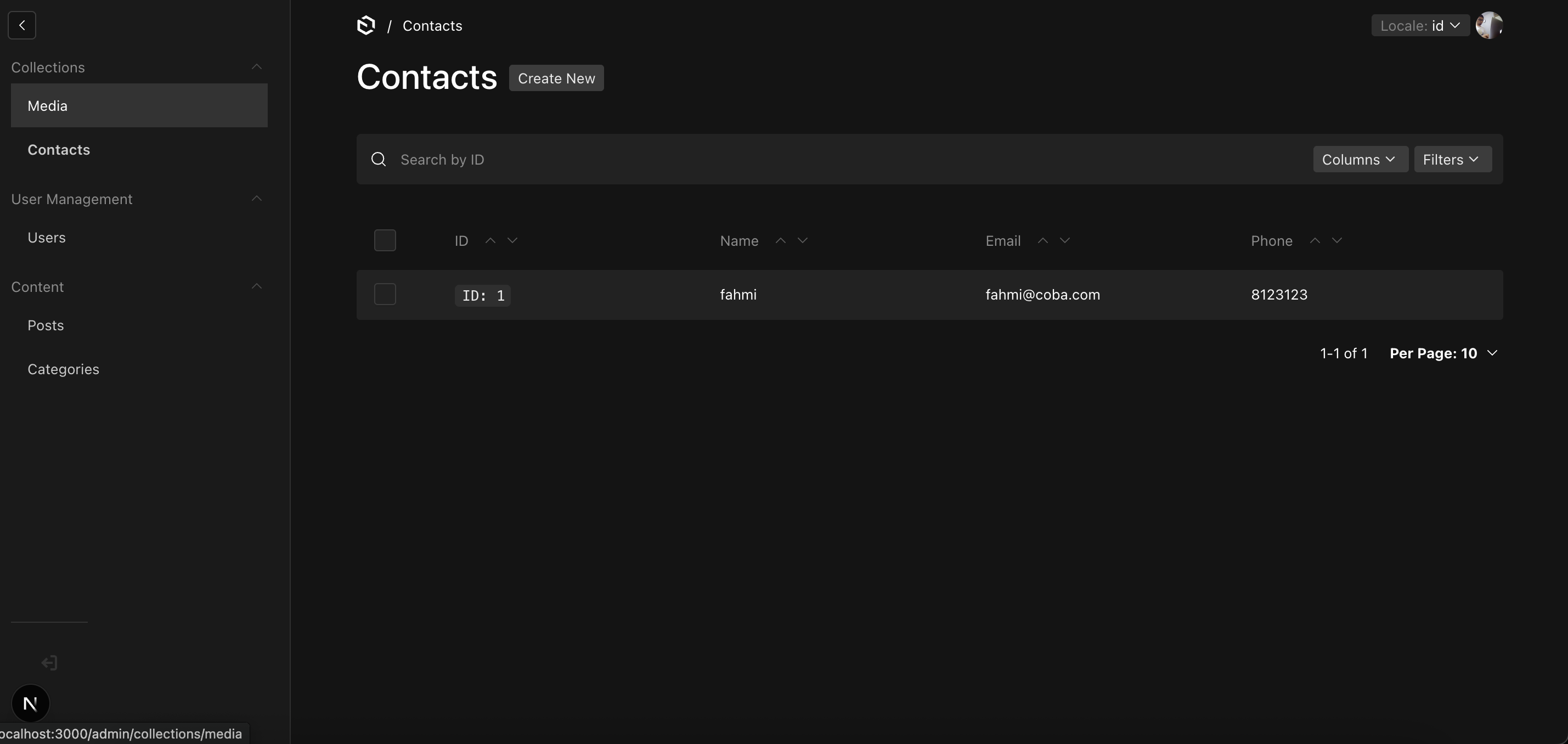 collections: [Users, Posts, Categories, Media, Contacts], // -> kita tambahkan pada bagian iniKemudian setelah kita jalankan aplikasi kita dengan menggunakan pnpm run dev pada terminal kita, maka aplikasi kita akan otomatis melakukan pengecekan perubahan. Jika aplikasi kita menggunakan mongoDB maka tidak akan ada konfirmasi perubahan database, jika menggunakan postgresSql atau sqlite maka payload akan meminta konfirmasi migrasi.